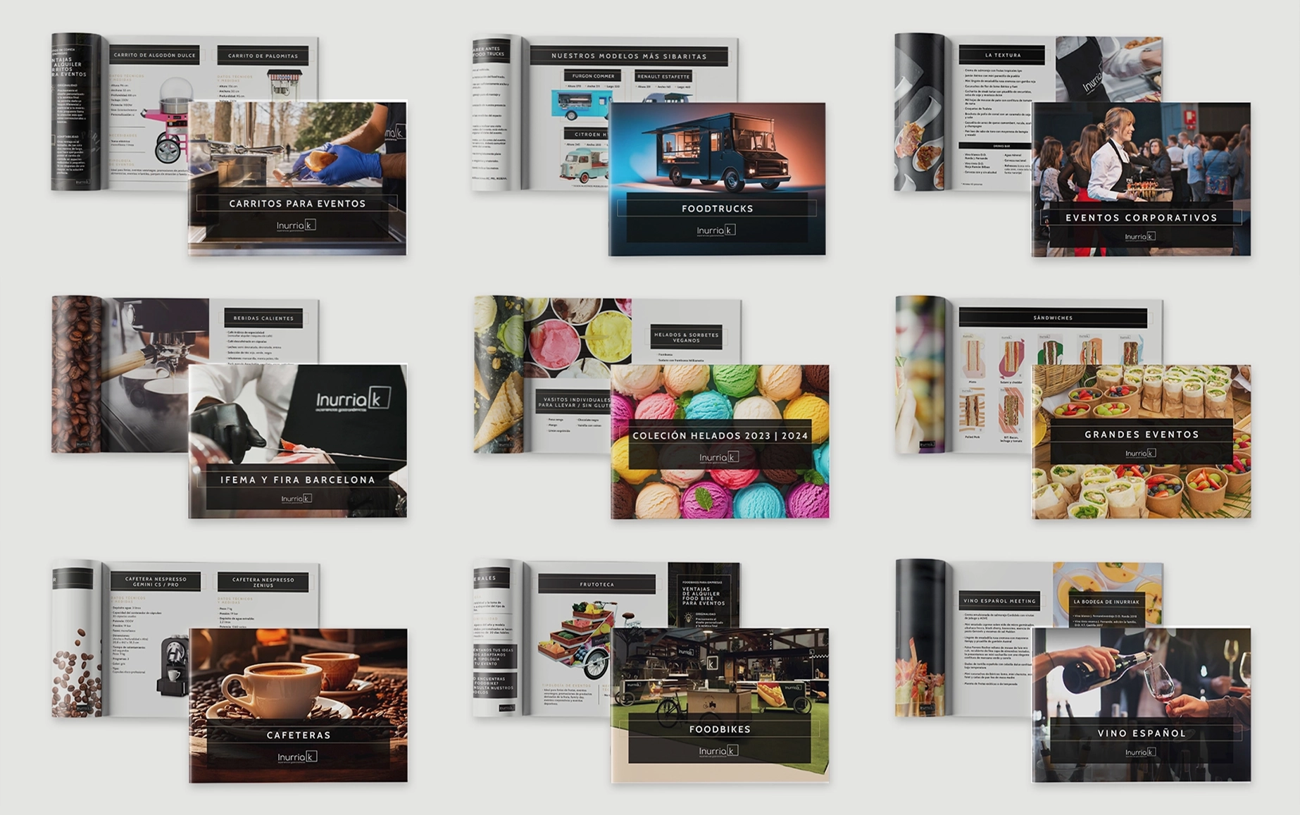 Inurriak es una empresa de catering corporativo especializada en experiencias gastronómicas premium, con presencia destacada en ferias y eventos como IFEMA y Fira Barcelona. Su objetivo era actualizar y profesionalizar su colección de catálogos y llevar acabo un rediseño de todos ellos manteniendo una identidad coherente y alineada con los valores de su marca.